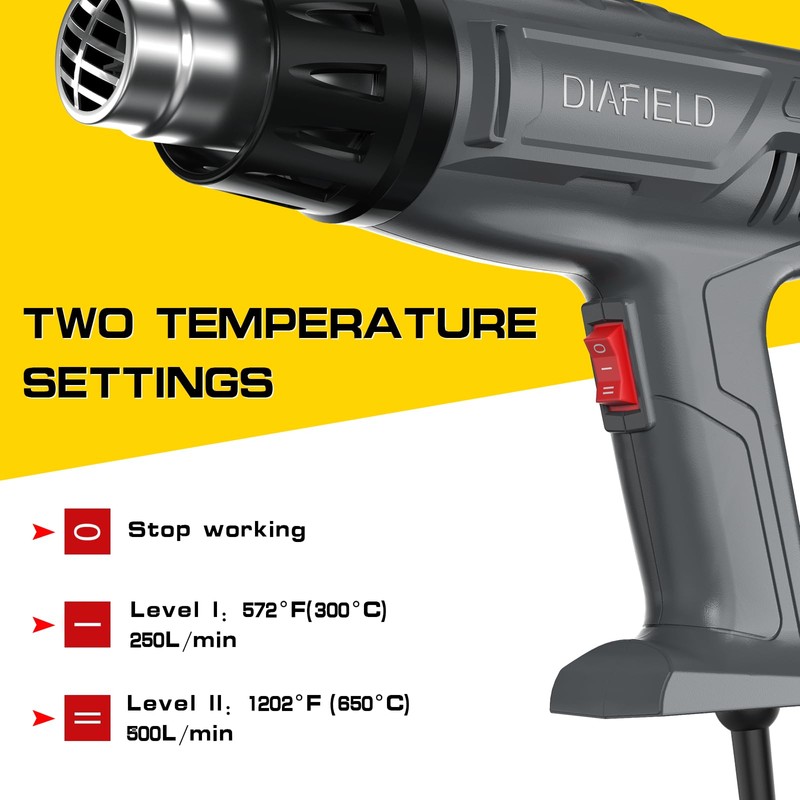 DIAFIELD 1850W Heat Gun, Dual Temperature Settings, AUTOXEL Fast Heat Hot Air Gun, Durable& Overload Protection, with 4 Nozzles for Shrink Wrap, Vinyl, Crafts, Epoxy Resin