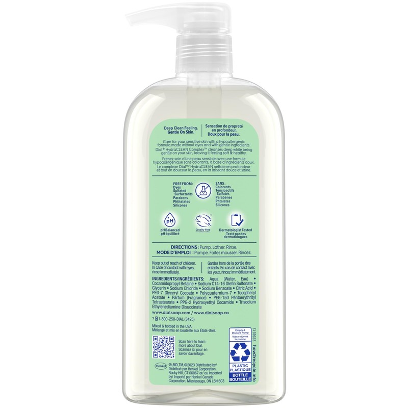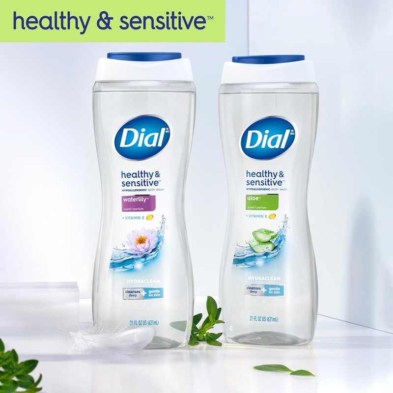 New from Dial! Healthy & Sensitive Aloe body wash. Care for your sensitive skin with a hypoallergenic formula made without dyes and with gentle ingredients. Dial HYDRACLEAN Complex feels deeply cleansing while being gentle on your skin, leaving it feeling soft & healthy.Dermatologist tested & approved under the Leaping Bunny cruelty free program. This package contains three 23 fluid ounce bottles of Dial body wash.