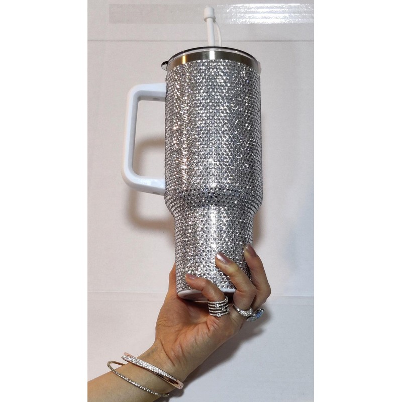 • Stylish Design: The bling design adds a touch of glamour and style to this travel cup. Insulation: This travel cup features insulation to keep your beverages hot or cold for extended periods. Convenient Lid: The lid has a built-in closer to prevent spills and a straw with a cap lid for easy sipping. Compatible: Reduced diameter base to fit standard car cup holders. Comfortable Handle: The cup has a good-sized handle for a comfortable grip.