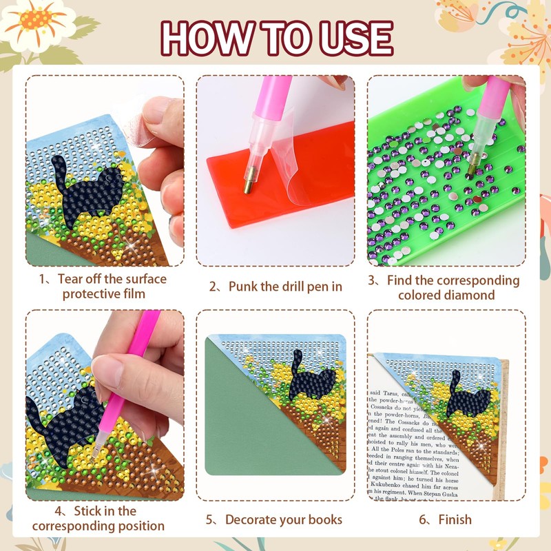 - Package Contents: You will receive 6 pieces of our diamond art bookmark kits in 6 styles,combined with black catpatterns, with 1 set of accessory tools, including 1 diamond tray, 1 sticky pen, 1 glue clay and enough color rhinestones, rich in style and abundant in quantity, convenient for you to use or replace, sufficient to meet your daily needs