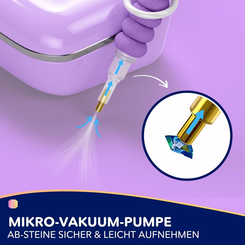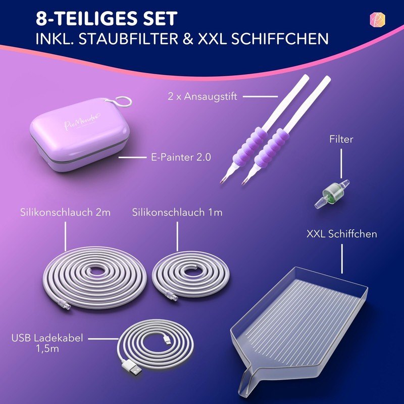 - Box contents: 1 x micro vacuum pump, 2 x diamond painting suction pen, 1 x felt holder, 2 x silicone hoses (1 m and 2 m), 1 x XXL boat, 1 x USB/USB-C charging cable (1.5 m), 1 x user manual and 1 x filter included