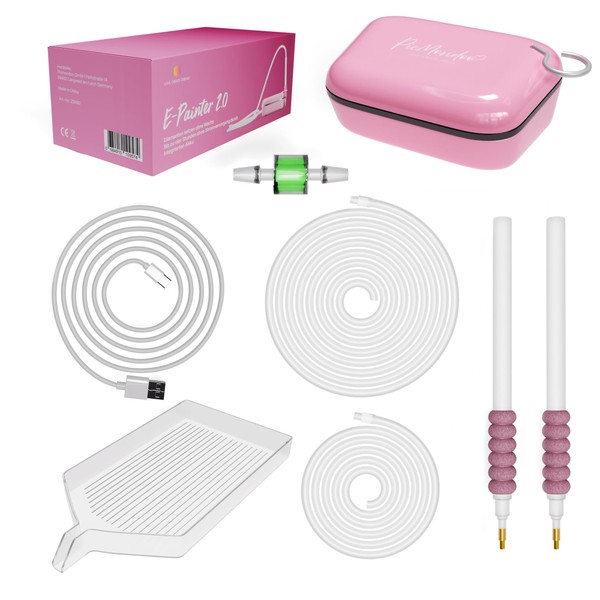 - Box contents: 1 x micro vacuum pump, 2 x diamond painting suction pen, 1 x felt holder, 2 x silicone hoses (1 m and 2 m), 1 x XXL boat, 1 x USB/USB-C charging cable (1.5 m), 1 x user manual and 1 x filter included