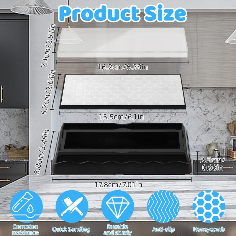 2. Equipped with a non-slip base to make the sanding process more stable and effective, the transparent plastic cover can well protect the sharpening stone from dust.
