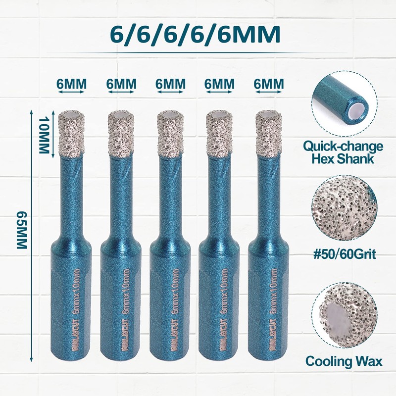 Diamond Tile Drill Bits 1/4" - MINLAYCUT 6mm 5PCS Diamond Hole Saw Core Drill Bit with Triangle Shank for Porcelain Tile Ceramic Granite Marble