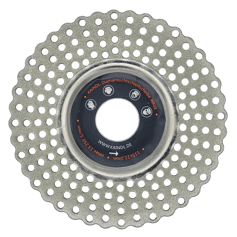 Diamond visual grinding disc wave diameter 115 x 22.2 mm. With this diamond grinding wheel you can keep a clear view. Sharpen either stationary with a drill using mandrel (item : 20250) or directly with the angle grinder 115/125 mm. The diamond coating used is specially designed for tool grinding and easily grinds even the hardest materials. The openings allow the work area to appear transparent during rotation, allowing both removal and position to be visually controlled. The holes provide additional cooling, resulting in a loss of hardness in the tool - due to so-called "Burning" - practically excluded. On the circumference, the diamond grinding wheel is equipped with a wave profile, which now also allows the edge area to be seen when working. The proven principle of "visual grinding" is thus even easier and further improved. The following tools are particularly suitable for sharpening with the Kaindl "WAVE" visual grinding disc: carbide-tipped tools (HW) such as Turning steels, impact drills, house cutters, TIG tungsten needles, indexable cutting plates, etc. Cutting tools such as chisels, scrapers, pliers, chisels, wood turning knives, scissors, knives, twist drills, mower blades, etc. In addition, materials such as ceramic, glass, minerals, tiles and stoneware can be processed. The wavy edge area can be used for cuts and minor separation work.
