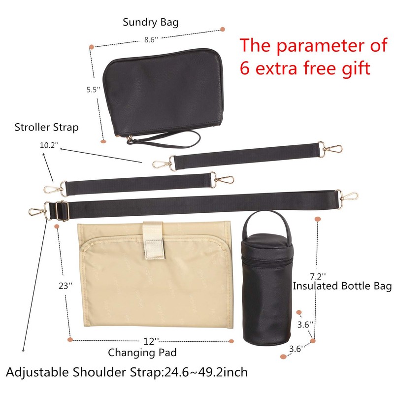 • What you will get: Diaper bag*1,changing pad*1,Shoulder Strap*1,Stroller strap*2.You can get everything you need. (11 pockets in total: 6 inside pockets,including an easy-to-clean waterproof pockets(use to store wet things)2 large compartments & 5 external pockets including a zipper Anti-theft smart phone pocket in the back,2 insulated zipper bottle pockets(fit bottle up to (7L *3.5W inch).