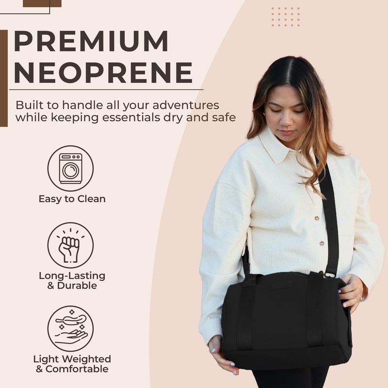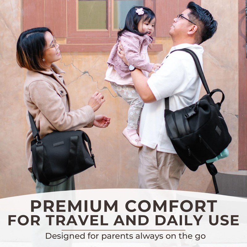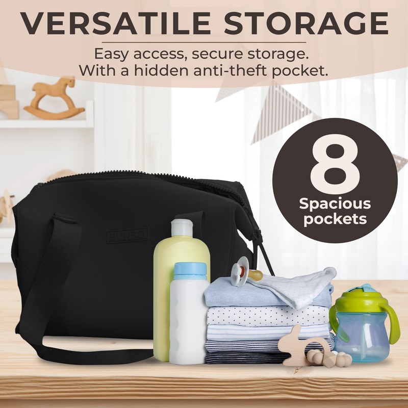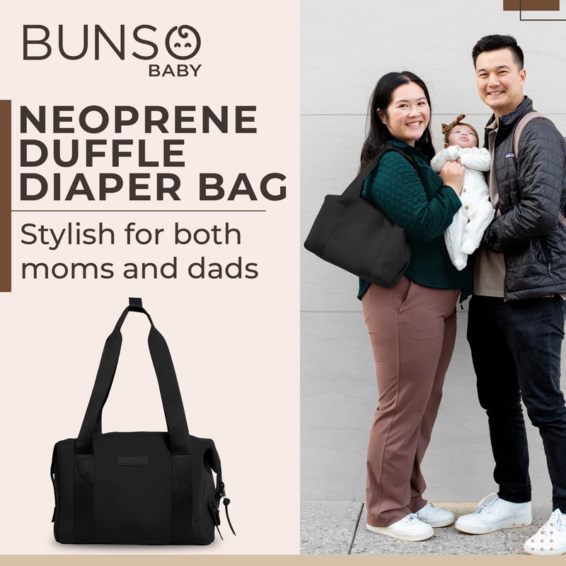 BUNSO Baby Diaper Bag Tote - Premium Neoprene Baby Diaper Bag with Portable Changing Pad & Pouch - Lightweight and Water-Resistant Diaper Bags - 12 x 7 x 8 Inches - Black