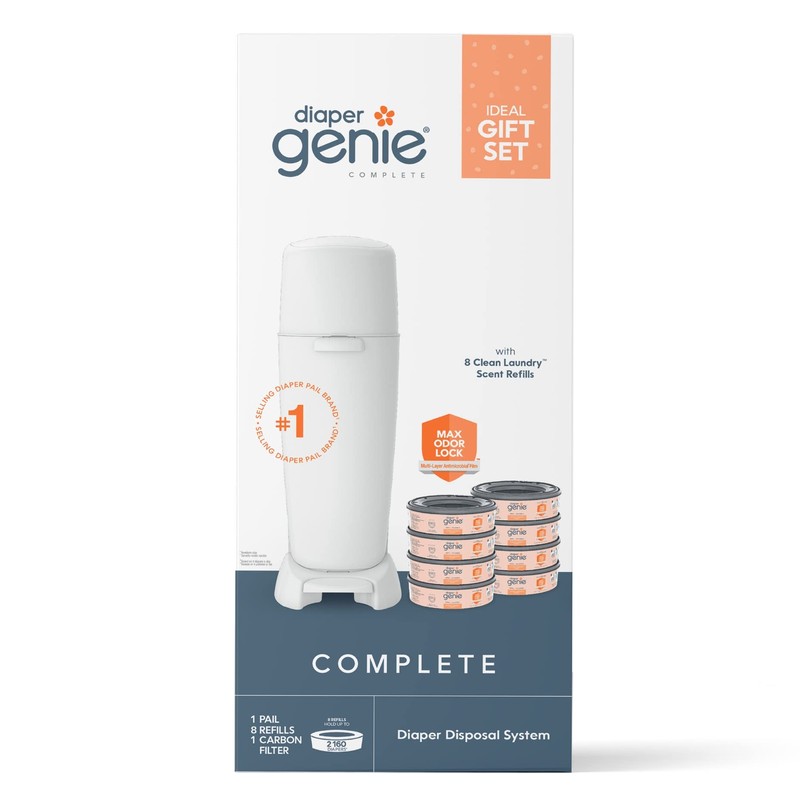 Style: **Diaper Genie Set**Being a new mom is hard enough, but with Diaper Genie we make tossing out dirty diapers fresh, clean and hands-free. With this diaper disposal system gift set, any new mom will be ready to take on poop-filled diapers like a pro. The diaper pail refill bags can hold up to 270 newborn diapers and features a 7-layer odor blocking protection. Don't fret over taking out the dirty diapers, the front-tilt diaper bin makes disposing of dirty diapers easy as 1-2-3. With fewer trips tossing baby diapers in the trash can, this Diaper Genie gift set is sure to make mom, dad and baby happy! From the #1 Selling Diaper Pail brand*, the Diaper Genie Complete Pail is all you need for a fresh, clean and sweet smelling nursery. *Based on Nielsen retail scan data 52 weeks ending 2/29/20 for Diaper Disposal category.
