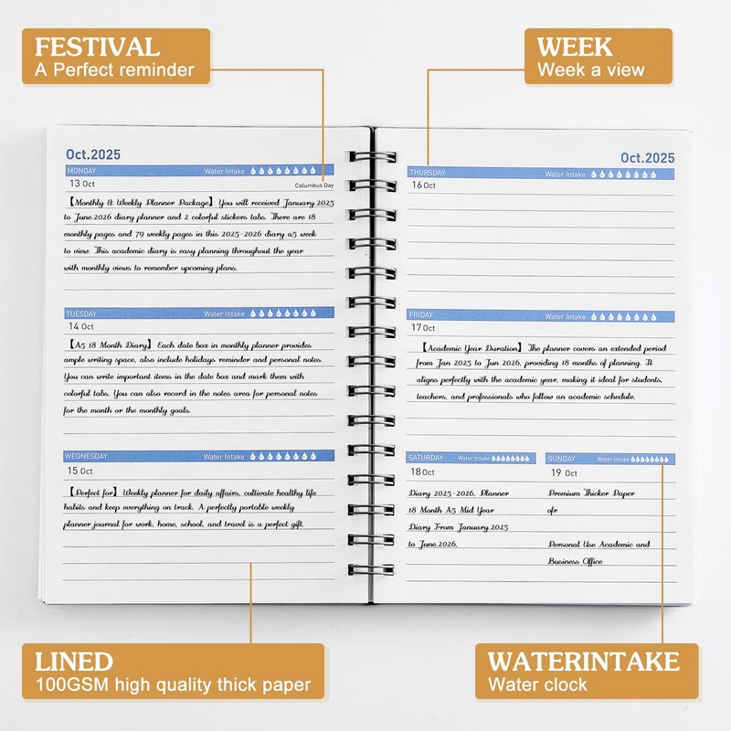 • 【Monthly & Weekly Planner Package】You will received Jul. 2025 to Dec.2026 diary planner and 2 colorful stickers tabs. There are 18 monthly pages and 79 weekly pages in this 2025-2026 diary a5 week to view. This academic diary is easy planning throughout the year with monthly views to remember upcoming plans.