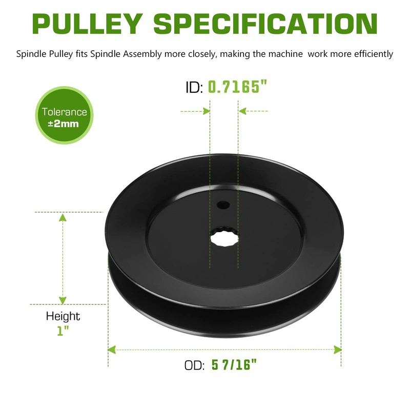 - Pulley Specs: Inner Diameter: 0.7165 inch, Outer Diameter: 5 7/16 inches, Height: 1 inch