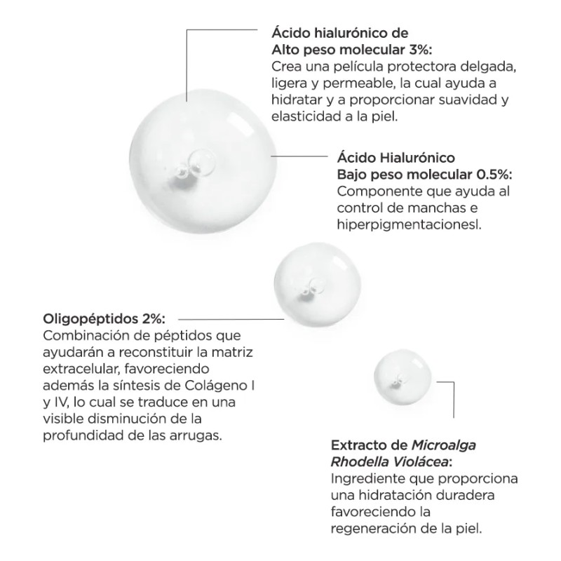 - Ácido Hialurónico de alto peso molecular: proporciona una hidratación superficial y ayuda a mantener la barrera cutánea.