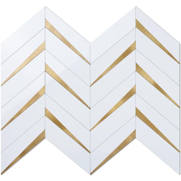 DICOFUN 1 Sheet Polished White Herringbone Peel and Stick Backsplash for Kitchen, PVC Mixed Metal Gold Chevron Stick on Backsplash Wall Tiles