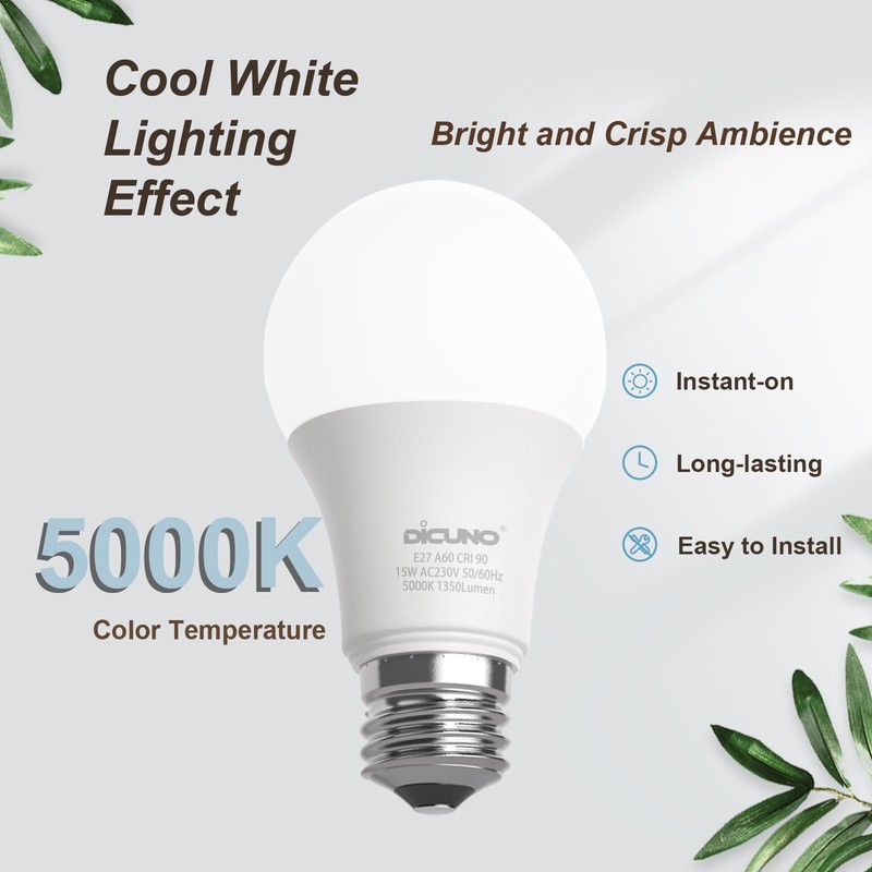 DiCUNO DiCUNO E27 LED Lampe 15W, ersetzt 100W, 5000K Kaltwei?, 1350LM, super hell, Matt, E27 A60 Edison Birne, CRI90, kein Flackern, nicht dimmbar, E27 LED Leuchtmittel in Kolbenform, 230V, 6er Set