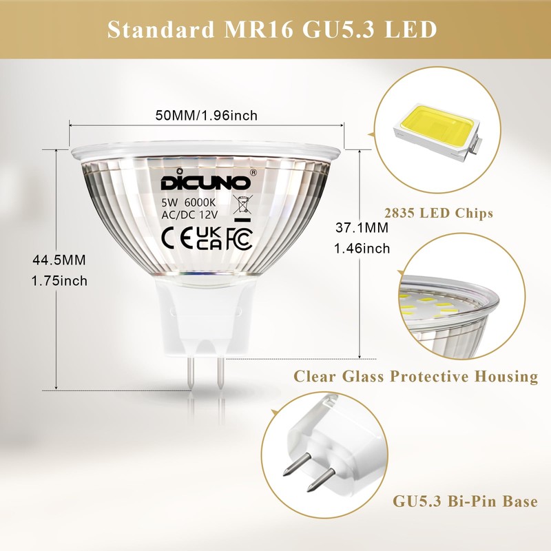 - 3. Hervorragende W?rmeableitung: DiCUNO 12V LED Lampe mit standardisierter GU5.3 Fassung besteht aus 24 Stck 2835 LED Chips im Inneren und einem Glask?rper. Sie bietet eine effiziente W?rmeabgabe und ist einfach zu ersetzen. Mit einer L70B50-Lebensdauer von 25.000 Stunden garantiert sie eine lange Nutzungsdauer dieser Birne.