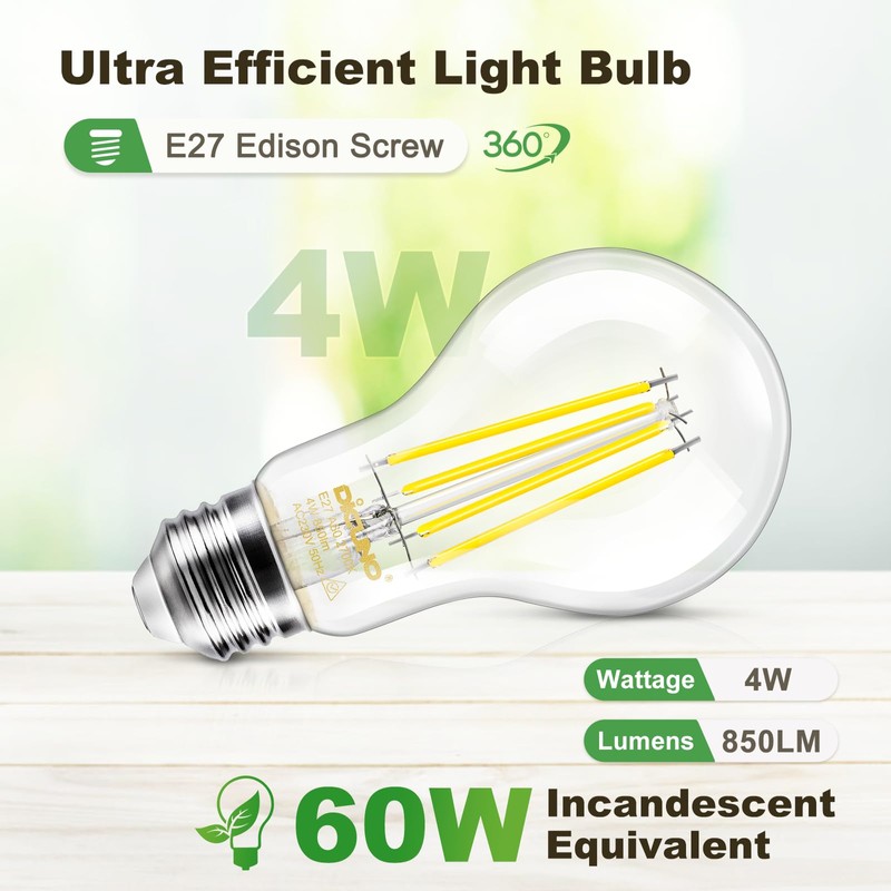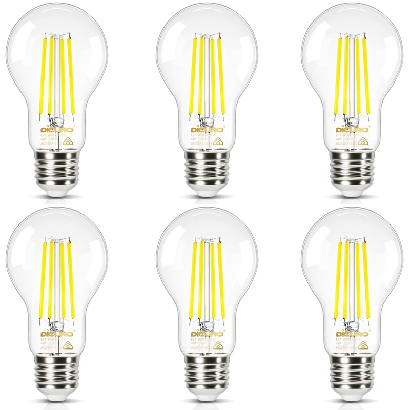 DiCUNO Edison LED Bulb E27, Classic Ultra Efficient Bulb, A Label, 4W, Replacement for 60W Incandescent Bulb, Warm White 2700K, 850lm, 360°, Clear, Energy Class A, A60 LED Bulb, Pack of 6