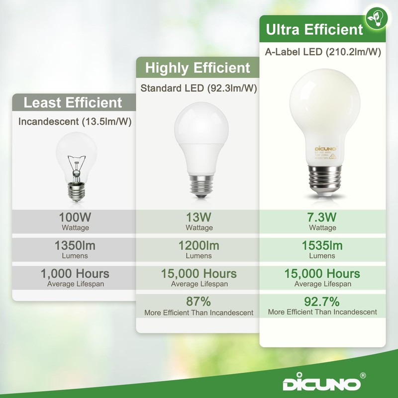 - 1. Ultra efficient & energy saving: DiCUNO E27 LED bulbs meet EU eco-design guidelines and achieve the highest energy efficiency class A (ηTM ≥ 210 lm/W). You save up to 92.7% energy compared to halogen bulbs and around 43.8% compared to general LED bulbs.