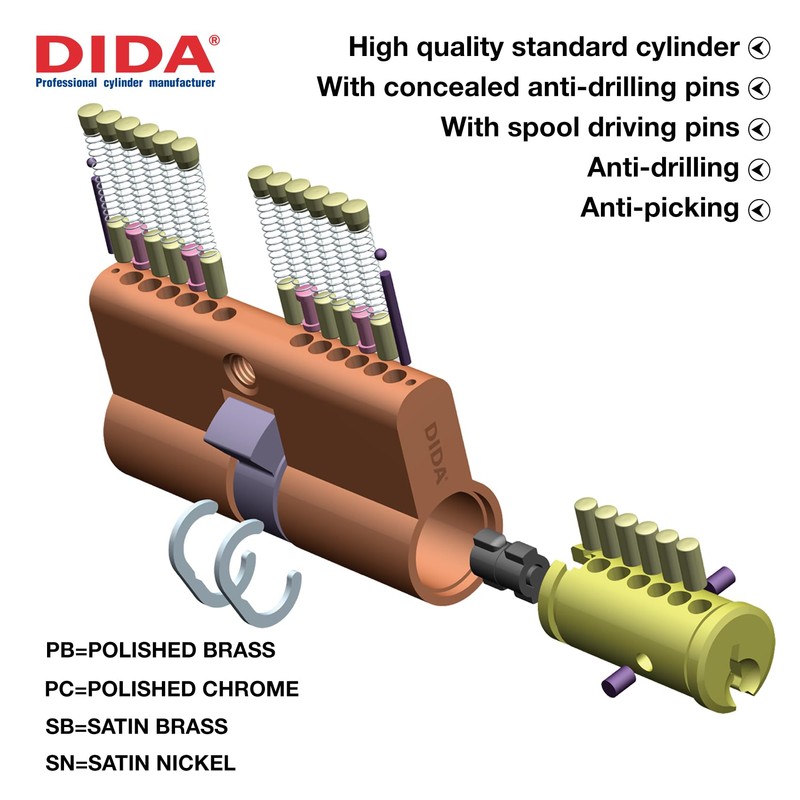 • PATENTED ANTI-BUMP SYSTEM:The DIDA lock barrel for doors features unique anti-bump protection that does not use trap pins.This ensures the turning of the cylinder key is extra smooth,while blocking access from bump keys.