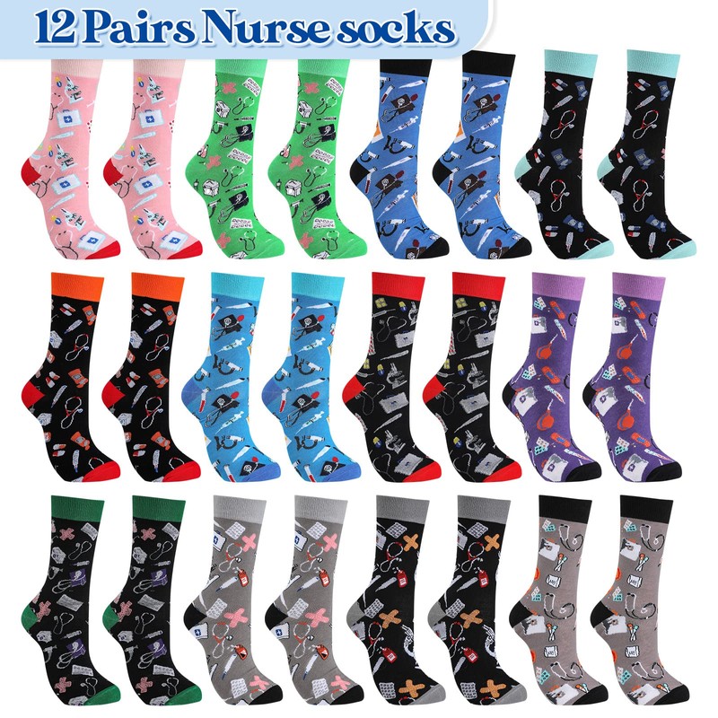 Didaey 12 Pairs Funny Nurse Socks Women Novelty Crew Socks Nursing Gift Nurse Yard Socks for Doctor Medical Dental Assistant Unisex