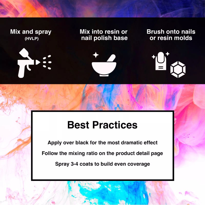 Mix into intercoat clear / clear base / or another clear carrier and apply 3 coats over the base. Finish with top coat clear.
