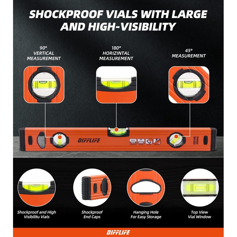 DIFFLIFE 18" Level & Tool Aluminum Reinforced Torpedo Level (18inch)