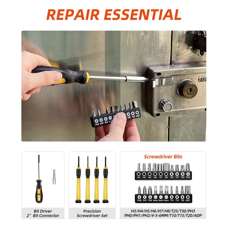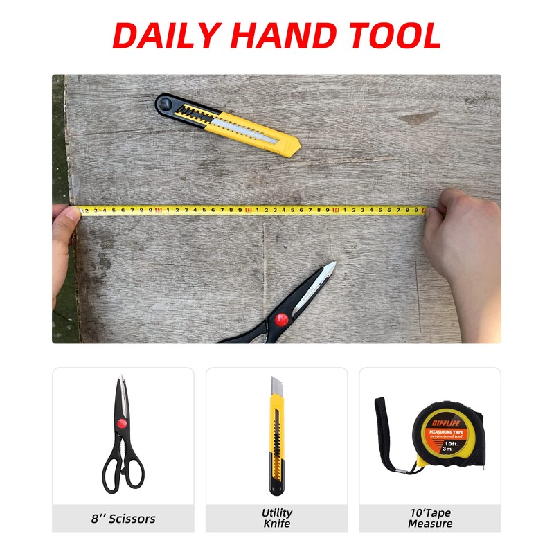 - 👷【Multifunctional Tool Kit】- Set includes tape measure, claw hammer, slip joint pliers, bit screwdriver, bit connector, scissors, utility breaker, precision screwdriver, hex key and screwdriver bits.