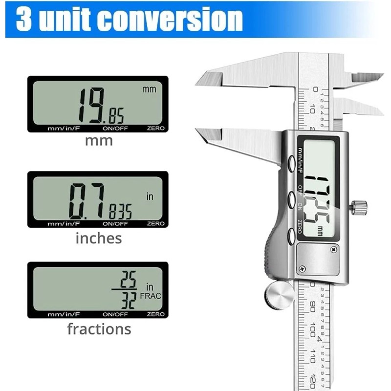 Digital Caliper Measuring Tool, 6 inch Stainless Steel Digital Vernier Caliper with Large LCD Screen Do you want precise and durable digital calipers? Our calipers have precise measurement units, multiple measurement modes, with an accuracy of ± mm / inch. At the same time, we are made of high-quality, durable stainless steel material, with long service life, perfect for daily use and home use such as screws, jewelry, DIY gadgets, etc. Product Features: 1. It has 4 measurement modes: external measurement, internal measurement, depth measurement and step measurement. 2. The large LCD display helps you get accurate results easily and automatically. 3. Heavy duty waterproof stainless steel body, dust protected and splash water resistant. 4. After you don’t use it for 5 minutes, it will automatically turn off to save power. 5. By simply touching the button, users can easily set zero and start a new measurement at any point of the scale. Ideal for measuring different length units.