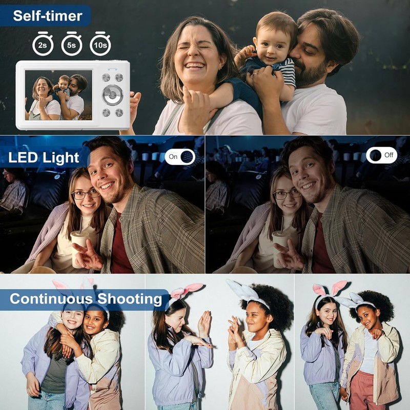 • 2024 Upgraded Digltal Camera- This digital camera is equipped with a 1/2.3 CMOS sensor, which helps capture vivid and clear 56MP images and record stable and smooth FHD 1080P resolution videos. No need for complex manual settings, automatically providing natural color images, suitable for children to cultivate their interest in photography and record interesting and unforgettable moments with family or friends.