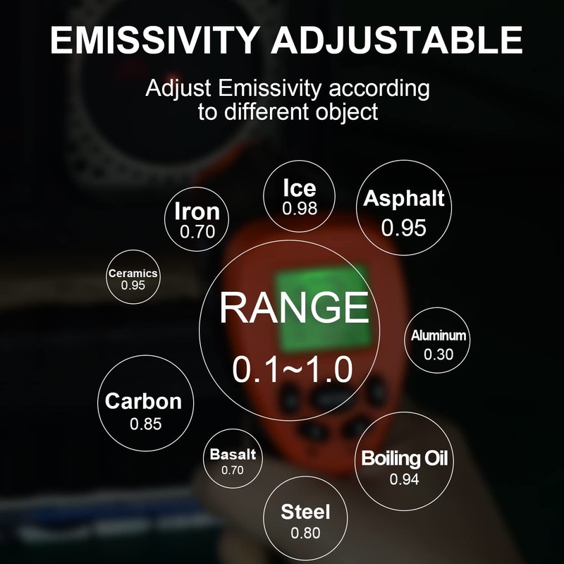 - 💖【Versatile Infrared Thermometer】Designed with 0.1~1.0 adjustable emissivity, it can be flexibly applied to different surface materials. For example, home, kitchen, food, stove, pizza, barbecue, boiling oil/water inspection, soap making and industrial HVAC, hot and cold spot finding, heating pipe insulation adjustment, automotive repair and welding and forging.