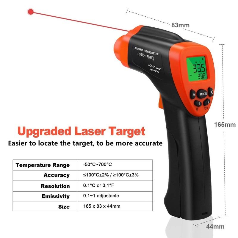 - Built-with upgrade temp sensor and 16:1 distance spot ratio, KE-980G contactless temperature gun could help you to measure temperature far from the object accurately, especially for very hot, cold and hard-to reach objects.