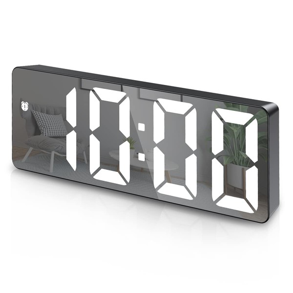 - LARGE DISPLAY AND MULTIFUNCTIONAL: The digital alarm clock adopts a large LED display (6.3"x0.7"-1"x2.36") so you can check the time at a glance even when you are far away. 5 Modes of Smart Clock: Clock Mode, Date Mode, Temperature Mode, Night Mode (On/Off), Alarm Mode The back button is easy to describe and easy to set up