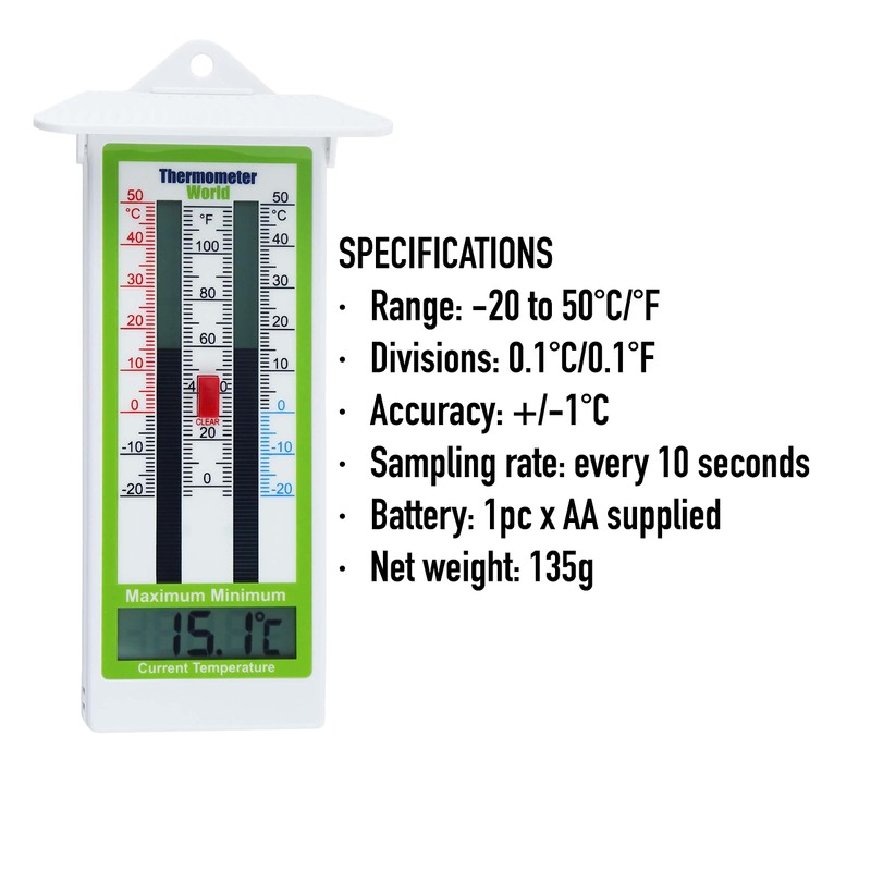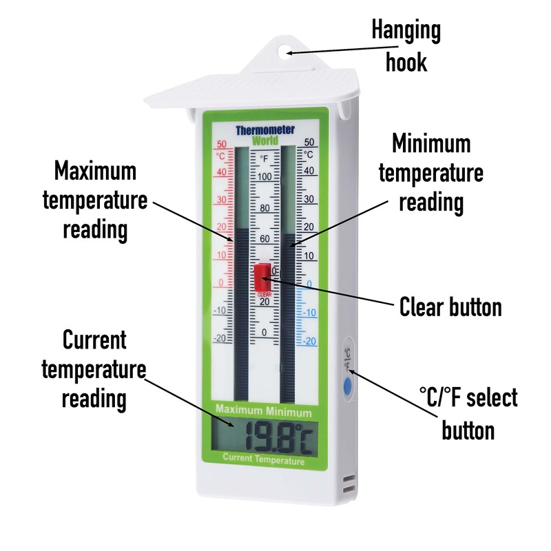 - CLEAR AND EASY TO READ – With a digital numerical current temperature display at the bottom and sliding digital max and min temperature bars above like a traditional maximum minimum thermometer it is very clear to read. This popular greenhouse thermometer also easy to reset button on the front. Temperatures can be changed from C to F with a button on the side of the thermometer.