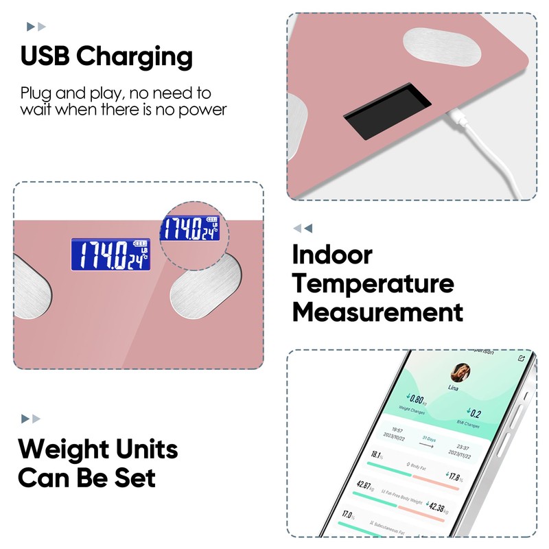 - [Sleek Design and Portable] With its sleek and modern design, this body fat scale adds a touch of elegance to your house decor. Its slim profile and sleek finish make it a stylish addition to any home. And the USB charging function ensures hassle-free operation and ensures that your scale is always powered up and ready to provide accurate measurements