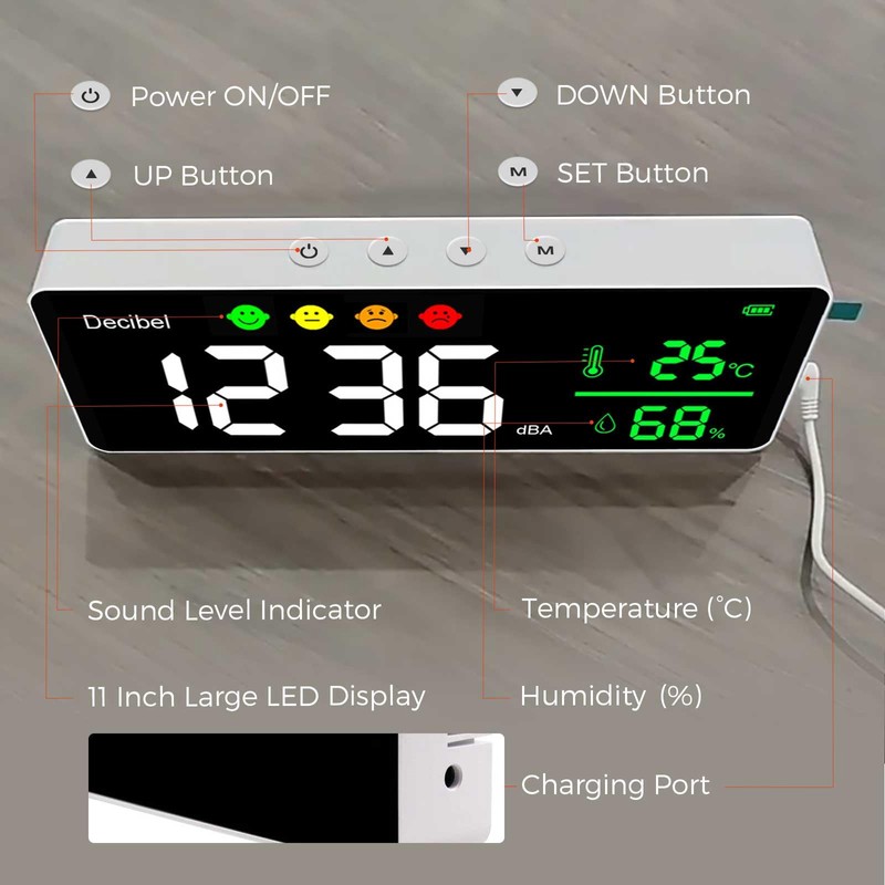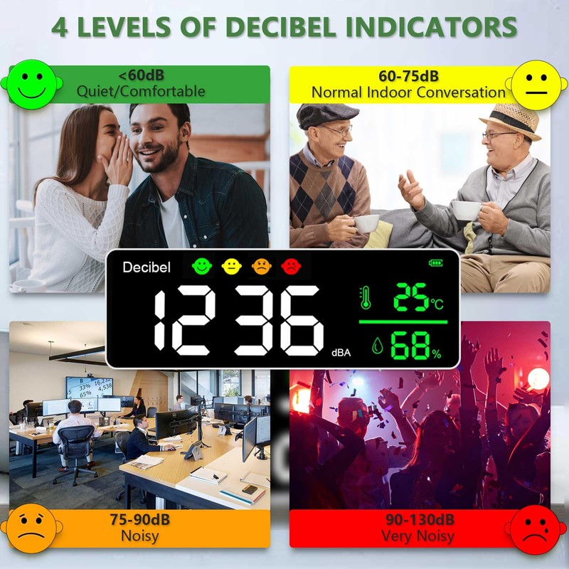 - Automatic alarm symbol: decibels, smiling face, temperature and humidity are integrated on the LED screen. When the decibel is at different levels, the smiley symbol changes automatically. [Green Symbol] Less than 40 dB; [Yellow Symbol] 40 to 60 dB; [Orange Symbol] 60 to 70 dB; [Red Symbol] Exceeds 70 dB.