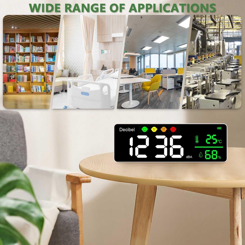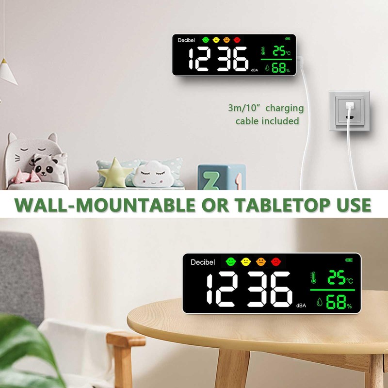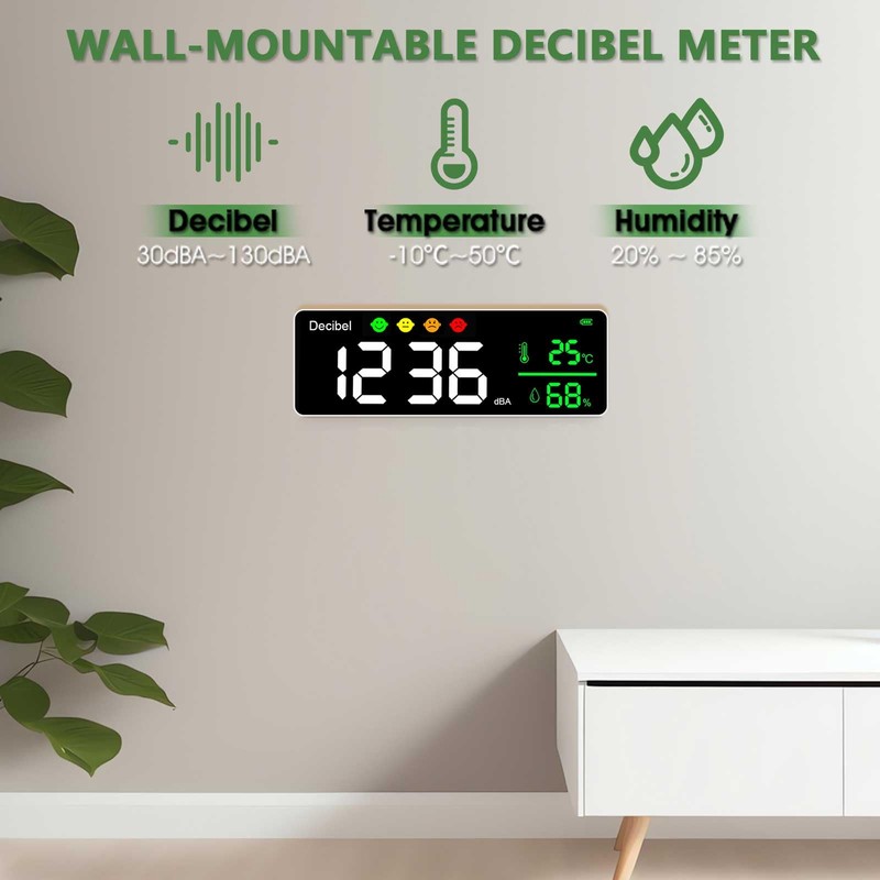 - Wall mounting widely used: Unlike portable digital decibel meters, this large screen LED decibel meter can be installed on a wall or table. Connect the power cord to ensure long-term use. In addition, it is very suitable for testing the sound level of classrooms, studios, driveways, factories, construction sites, houses, offices, etc.