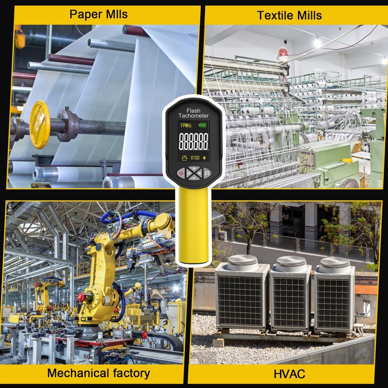 - Strobe Frequency Adjustable: The flash tachymeter actually provides a pulsed light source with adjustable frequency and very short duration. If an electric fan is spinning at 1300 revolutions per minute, the flash frequency is also 1300 times per minute, and since the two speeds are equal (synchronized)