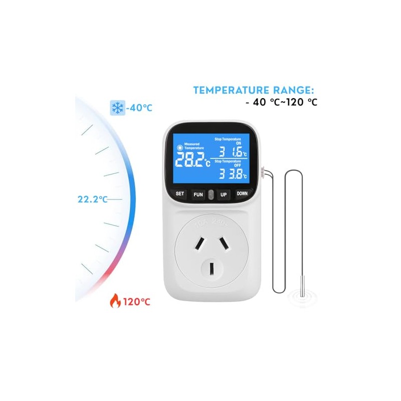 - [Specifications] The temperature range is -40℃ to 120℃ , the display accuracy is 0.1℃, and the measurement accuracy is +/-1%. The thermostat switches between heating and cooling modes based on your set start and stop temperatures.