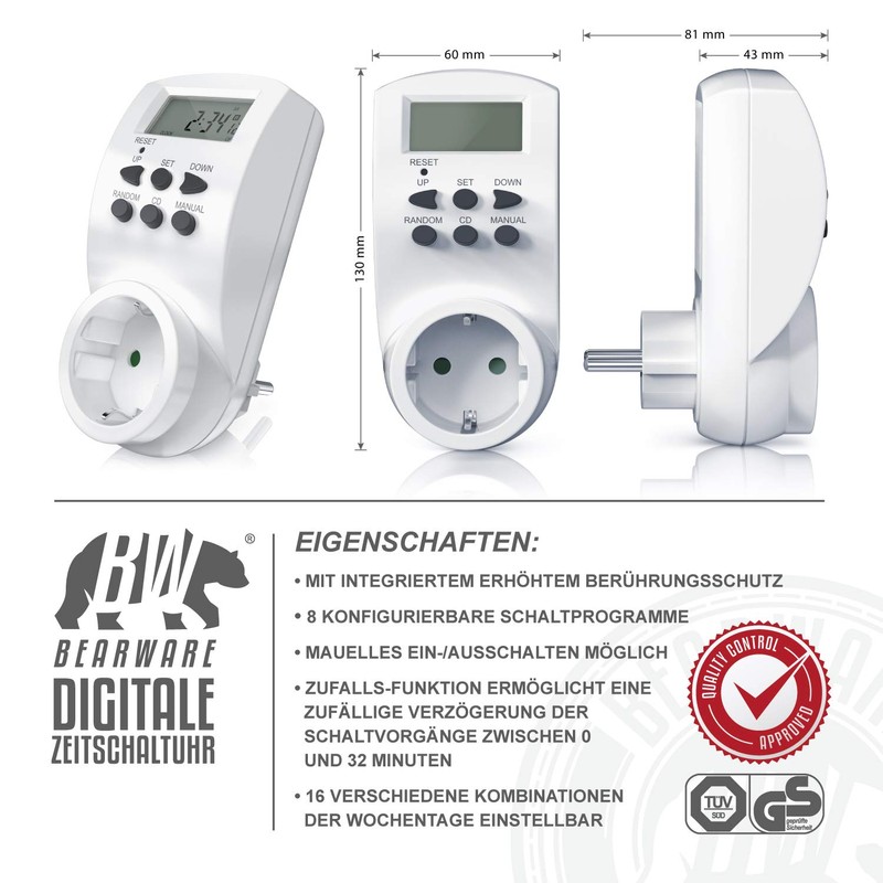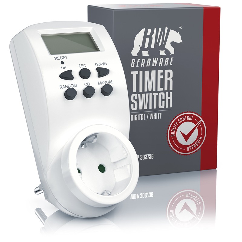 - Use: The Bearware digital timer is characterised by many additional setting options, easy operation and maximum safety for your household. It is especially helpful for daily recurring circuits when it comes to standby devices that cannot be switched off completely and consume unnecessary power. | Note: Not suitable for switching inductive loads with motor capacitor.