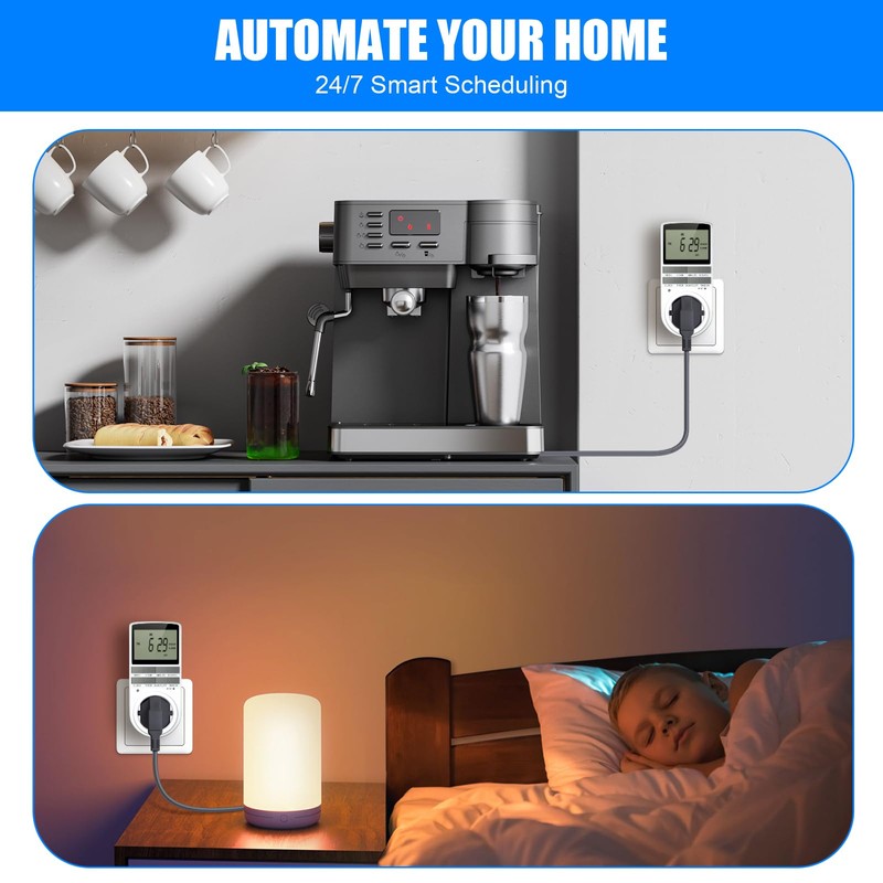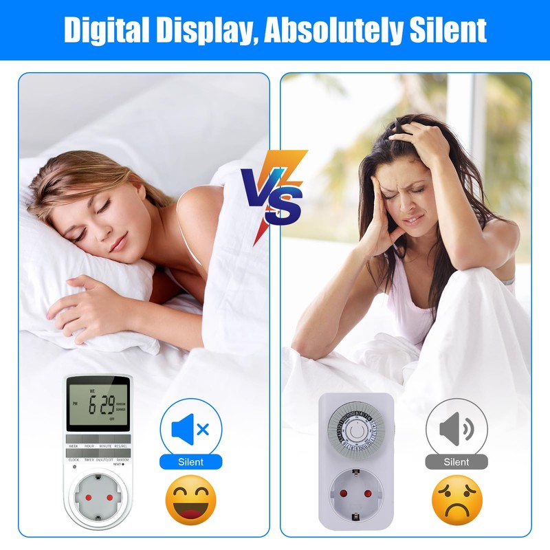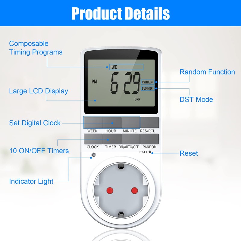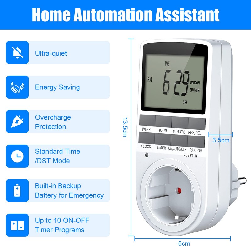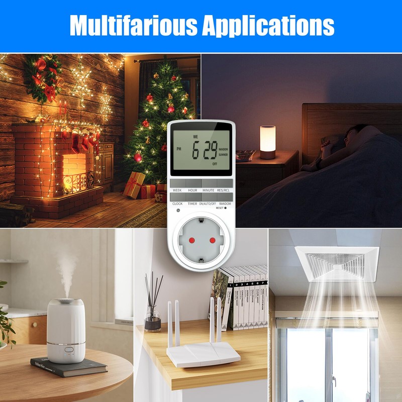 - Germany Plug: Maximum power of digital timer up to 3680W, suitable for various applications. With overcharge protection function, automatic shut-off to prevent the life of the battery from being shortened by overcharging. This digital timer can be used for indoor lighting, Christmas lighting or decoration, network equipment, greenhouses, aquarium lighting, air pumps and household appliances.
