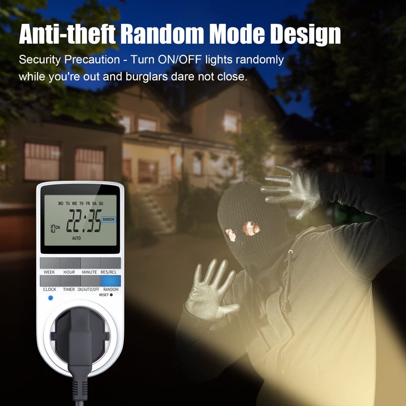 - Anti Theft Mode Design The electric timer socket can randomly turn on/off the lights between 18:00 and 6:00 in the morning. Useful Safety Feature The programmable timer plug supports your TV or side light randomly turn on/off at different times, create an illusion that someone is inside, protect your house from uninvited guests. Go on holiday with peace of mind.