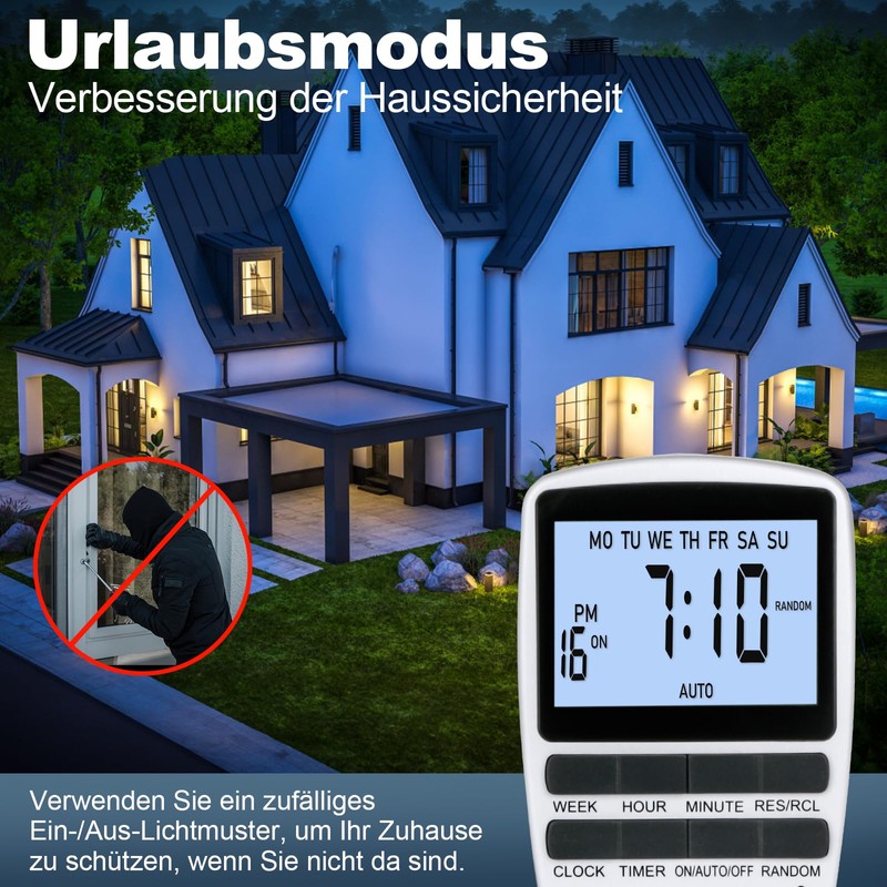 - HOLIDAY SECURITY Our socket features a unique random mode that makes your home look occupied by turning the light on and off at certain times. This special feature creates the illusion that someone is at home and helps deter potential burglars. It makes our weekly timer very useful, especially when you are away from home for a long time, and provides extra protection for your property.