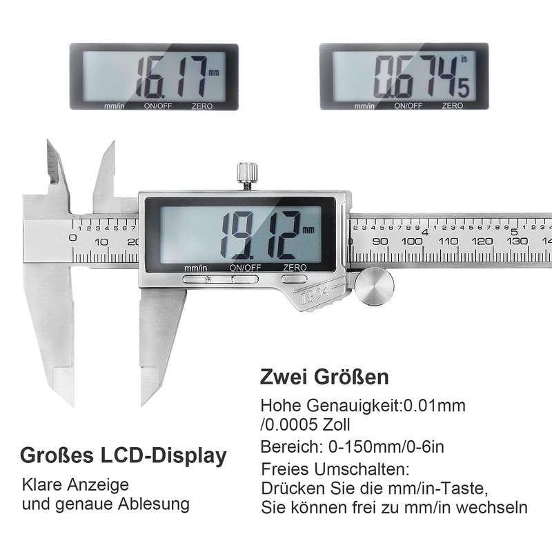 - Inch/mm Conversion: Two units of measurement (inch/mm), which can be quickly switched between with one button. Measuring range: 0–150 mm (6 inches) / Resolution: 0.01 mm (0.0005 inches) / Accuracy: ±0.03 mm (0.001 inches)