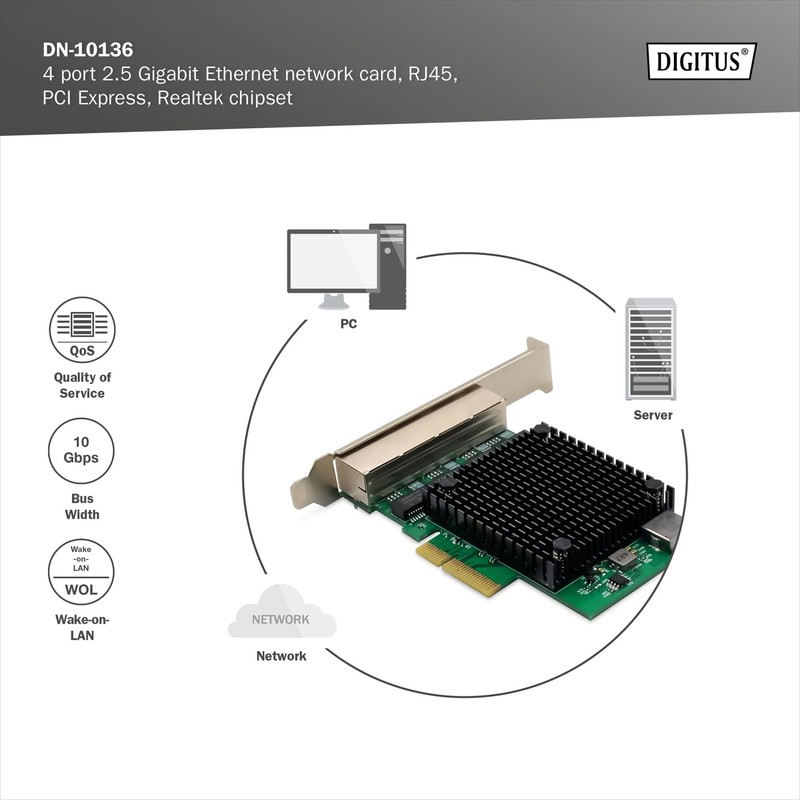 DIGITUS 2.5 Gigabit Ethernet Server Network Card - 4 Port RJ45 - NIC - RTL8125B - 10/100/1000/2500 Mbps