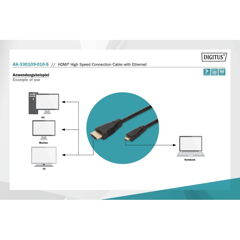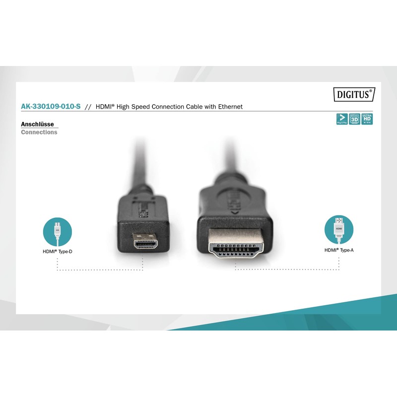 Digitus AK-330109-010-S 1.0m Type D (Micro) Male - Type A Male HDMI High Speed with Ethernet Connection Cable with Gold Plated - Black