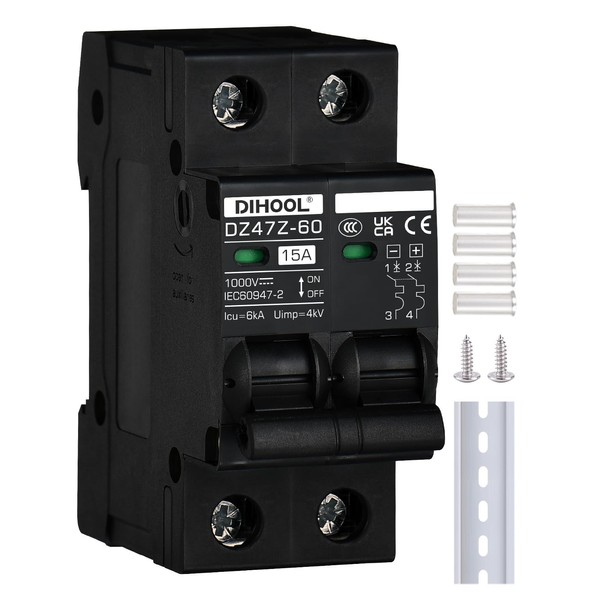 DIHOOL DC Circuit Breaker 2 Pole DC 12-1000V 15A Miniature Circuit Breaker, For Solar Panel Controller, For Solar Panel In Solar Power System