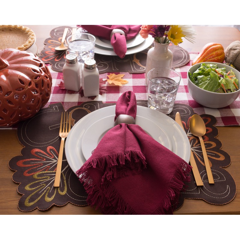 Stylish Placemats DII embroidered placemats are a staple for every kitchen table, breakfast nook, and dinner table. Made of 100% Polyester. Set of 4 placemat each measure 13x19". "Gobble, Gobble", acorns and fall leaves are delicately embroidered. They are perfect for dressing up your table for dinner parties, Thanksgiving and holidays during fall season. Visit the DII Brand Store on to view all of the colors and designs DII has to offer. You will also find the coordinating oversized napkins to complete your dining set. Coordinate Your Holiday Table With DIIDII offers a wide assortment of products for the holiday seasons including beautiful tablecloths, table runners, napkins, placemats, throws, ceramics, aprons, dishtowels, and décor. Search DII holiday or visit our store front by clicking the DII link at the top of the page to explore our products.