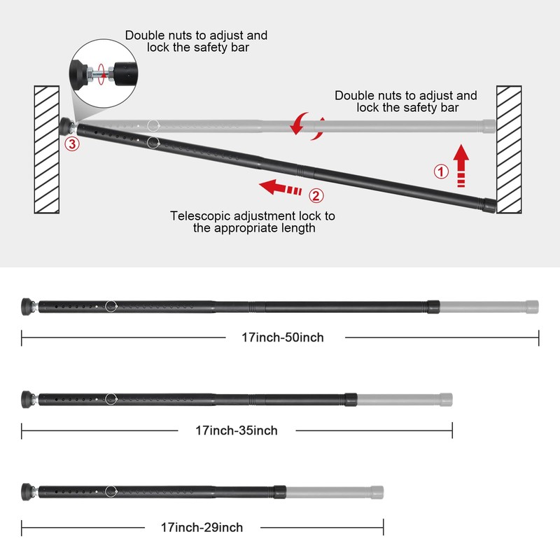 【STURDY】The sliding glass door security bar is made of 1" diameter black painted metal, which is stronger and more durable than 3/5" window safety bars, less prone to damage and long-lasting 【A variety of adjustable 】 the patio door security bar with a total length of 50inch can be freely stretched and adjusted between 17.7-50.5inch to perfectly adapt to various lengths 【Non-slip end design】The sliding door stop is designed with a rubber tip to increase friction and fix it with double nuts to adjust the tension, not easy to fall off, no drilling required, easy to install, and will not damage the door frame. You can use it with confidence 【Widely used】This sliding door security bar can be used as a sliding door lock to maintain the safety of your pet and family, and it can also be used as a window security bar. 【Premium service】If you have any questions about our door and window rod, you can contact us, we will reply you within 12 hours