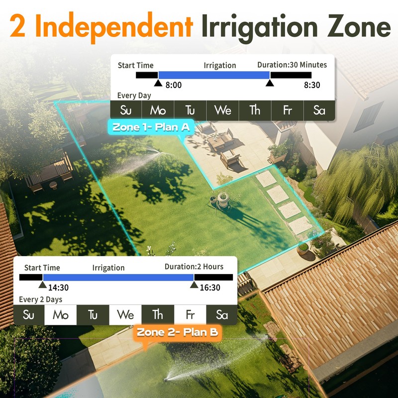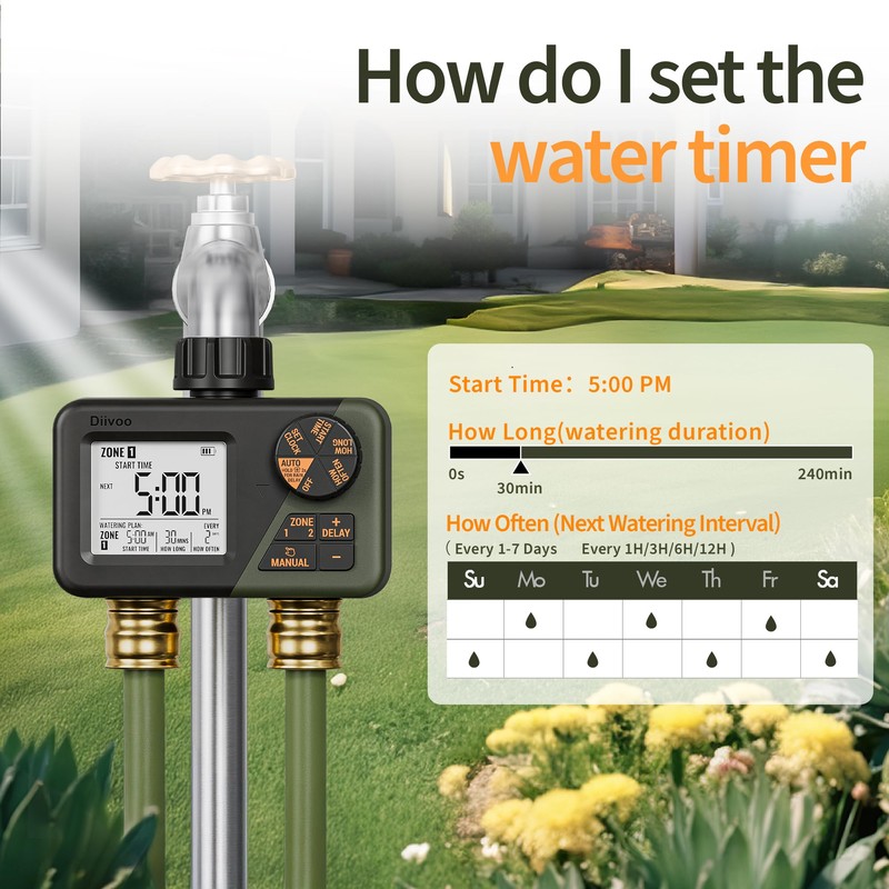 - 2 Zone Separate Watering Timer: 2 outlet water timer makes it easier to schedule watering separately for different areas. You can set the Start Time, Watering Duration is 0 to 240 min, Watering Frequency from 1H/3H/6H12H or from every day to every 7 days, including even days only or odd days. Diivoo hose timer gives you more accuracy for your variable watering needs