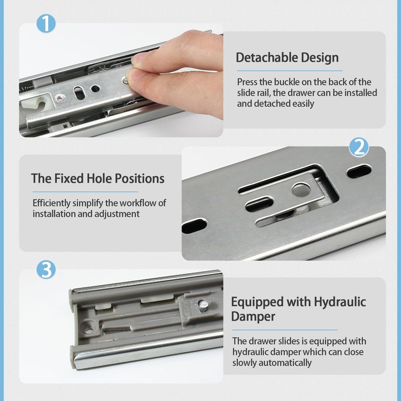 • Soft Close Feature: These drawer slides come with a hydraulic damper for a smooth closing. Plus, with their double spring design, they move quietly, bringing a cozy and peaceful vibe to your home or project.