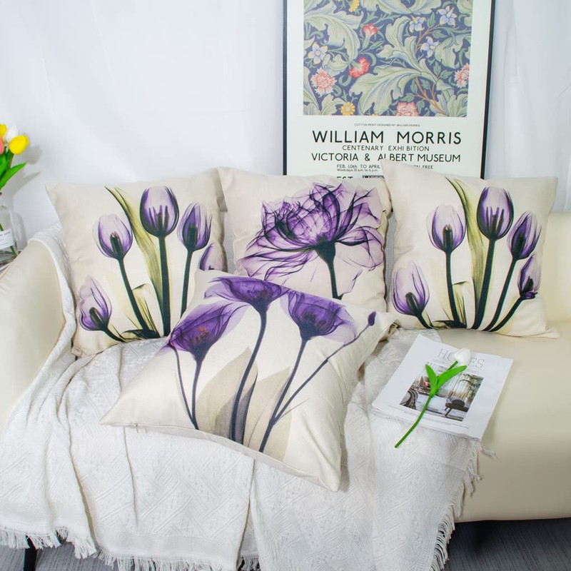 DILOXNSU Cushion Cover 50 x 50 cm, Set of 4 Cushion Covers, Purple Tulip Art Flower, Decorative Cushion, Modern Sofa Cushion, Linen Cushion Cover, Decorative Cushion, Aesthetic Couch Cushion for Sofa,