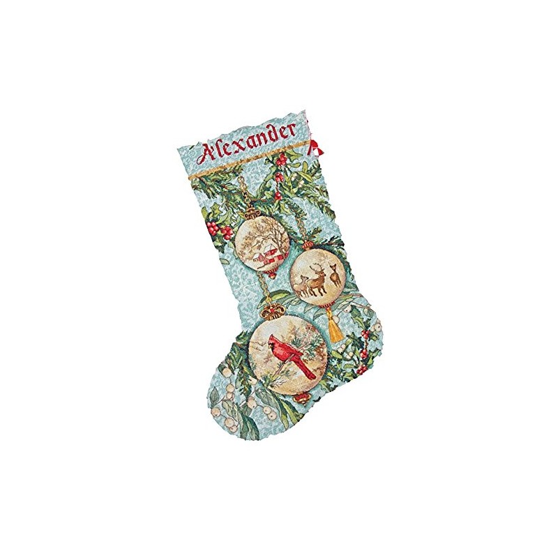 This year, hang a homemade Christmas stocking above the fireplace! The Dimensions Counted Cross Stitch Personalized Christmas Stocking Kit features three elegant Christmas ornaments hanging delicately on a branch. Personalize this Christmas craft by stitching the name of a child, friend, or loved one above the elegant Christmas scene! Includes presorted cotton thread, metallic thread, wool yarn, 16 count light blue Aida, polyester felt, needle, and easy to follow instructions with alphabet. Completed stocking measures 16'' long.